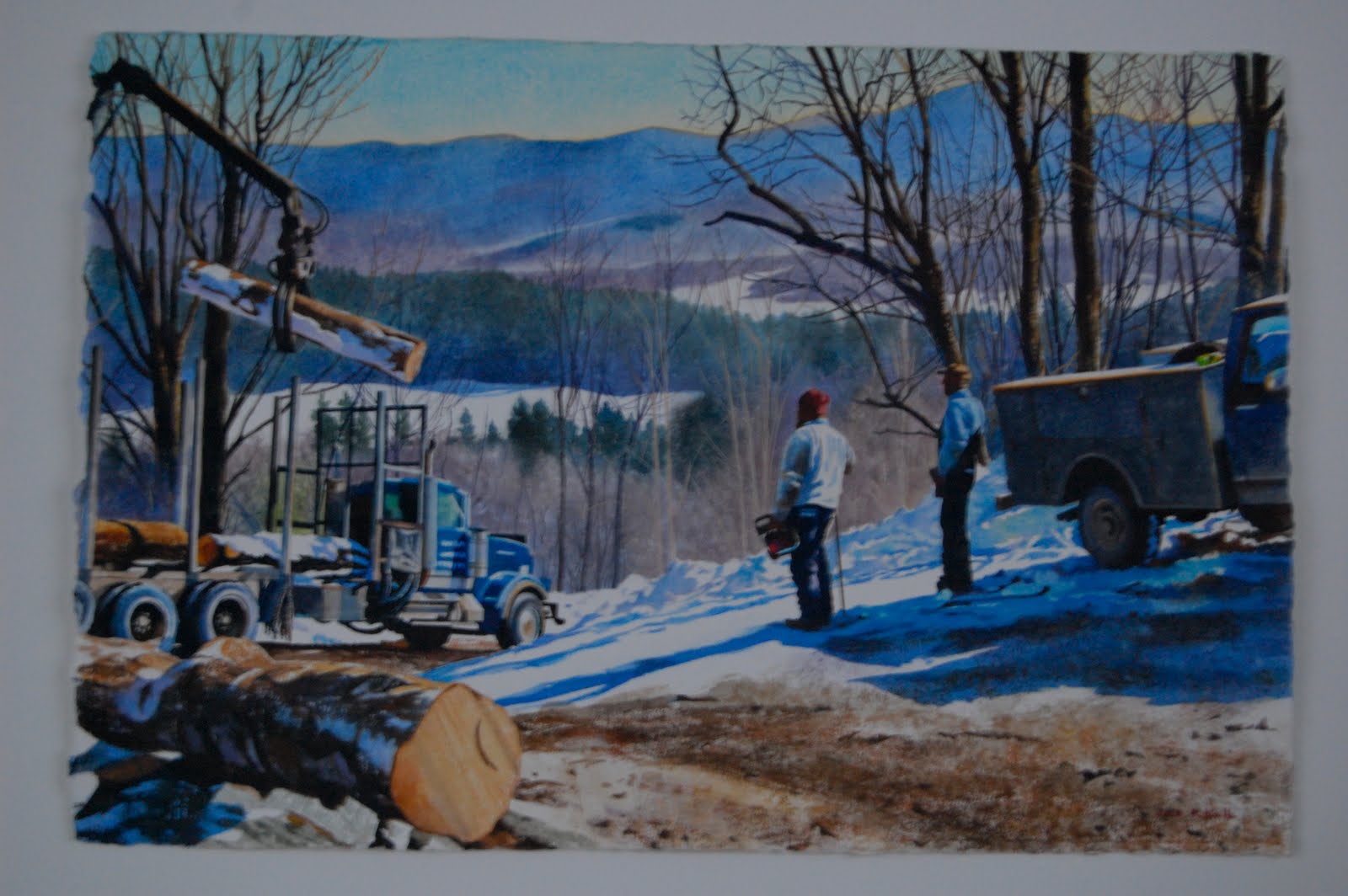 This is an image of a watercolor I did this fall. It is of Larry and Mark Sherman on a job they had in Lincoln, Vermont a couple years ago. This scene was on a very cold day in March, as they watched the truck loading at the landing. Mount Abraham can be seen in the background.